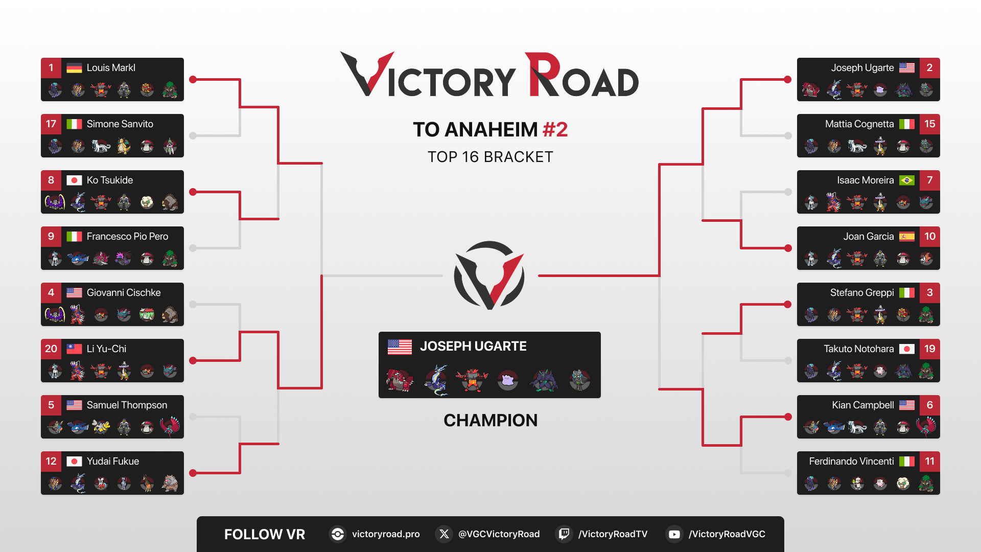 2-time Regional Champion Joseph Ugarte has won his record-breaking fifth VR tournament! Joseph defeated Taiwanese Li Yu-Chi in the finals of Victory Road’s latest Regulation Set I event, using a Groudon + Miraidon team!