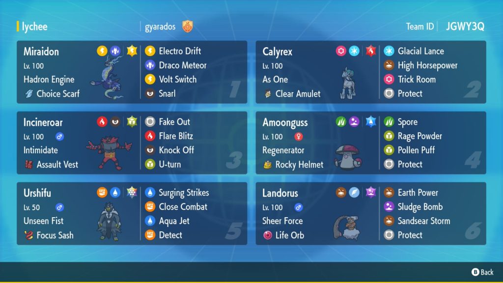 This team is a lot more offensive than the Leftovers Calyrex set that I was running with the Kobayashi team, and changes the main restricted Pokémon from Miraidon to Calyrex. However, it is a lot less bulky than the Kobayashi team, so I was very skeptical at first. Even though many of the same Pokémon were used, they were used very differently because they have different sets. Also, using Amoonguss over Farigiraf changes how the team plays a lot. I was also skeptical about Miraidon, because the only other item used on Miraidon before was Assault Vest, and that set only worked on one specific team. Choice Scarf also seems redundant at first because Miraidon is already one of the fastest Pokémon in the game. However, this option opened up an item slot on Urshifu to have it hold the Focus Sash, which I knew was going to be way better.